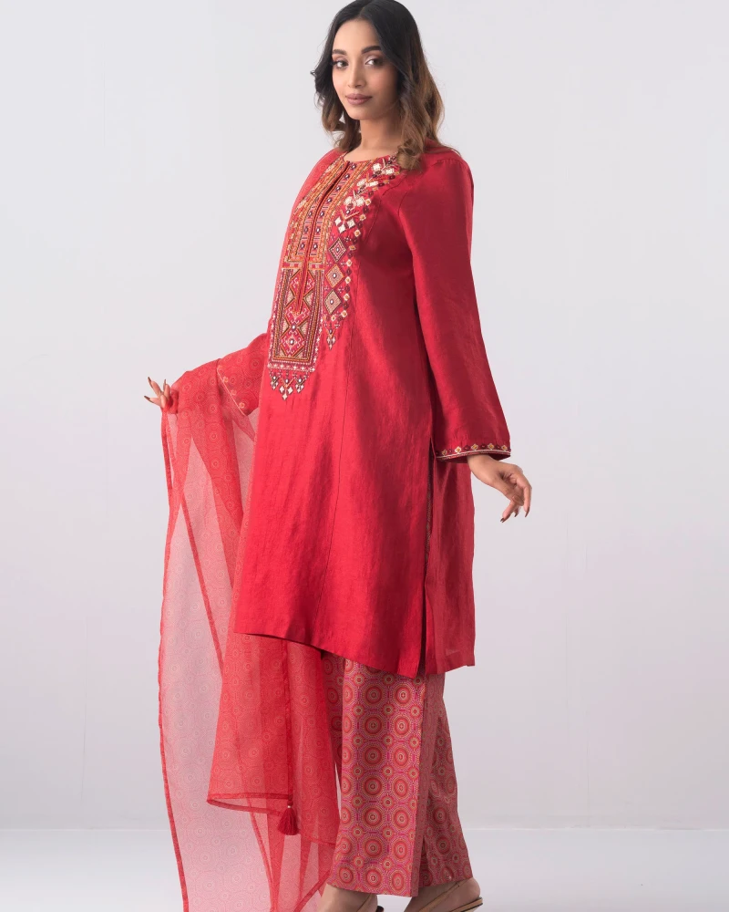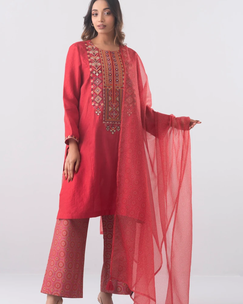 Smart Fit Embroidered Three-Piece Ethnic Set with Organza Dupatta